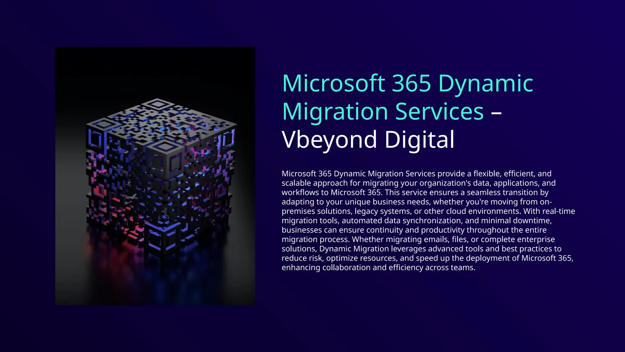 VBeyond Digital offers Microsoft 365 dynamic migration services that facilitate the smooth migration of data, applications, and workflows to Microsoft 365, tailored to each organization's needs. The migration process includes assessment, strategy creation, data preparation, pilot testing, execution, and post-migration evaluation, ensuring minimal downtime and continuity. Additionally, VBeyond provides consulting, technology support and maintenance, and automation solutions across various business functions such as HR, operations, marketing, finance, and customer service.