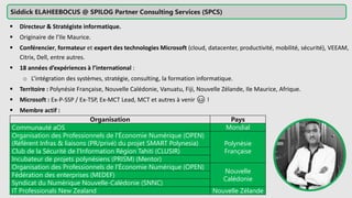 This document profiles Siddick ELAHEEBOCUS, the director of SPILOG Partner Consulting Services (SPCS). It provides details on his background, areas of expertise including Microsoft technologies, and the territories he serves. It also lists some of the organizations and professional networks he is involved with. The document highlights some of the key challenges small and medium businesses face with technology today such as outdated systems, lack of mobility, security issues, and cyber threats. It promotes Microsoft 365 as an integrated solution to address these challenges through features for productivity, collaboration, and security.