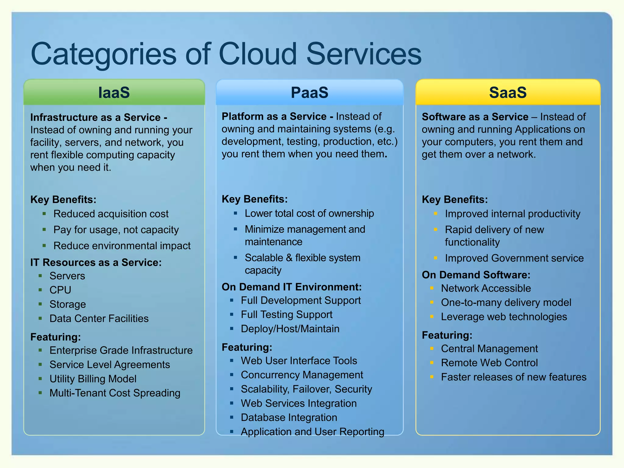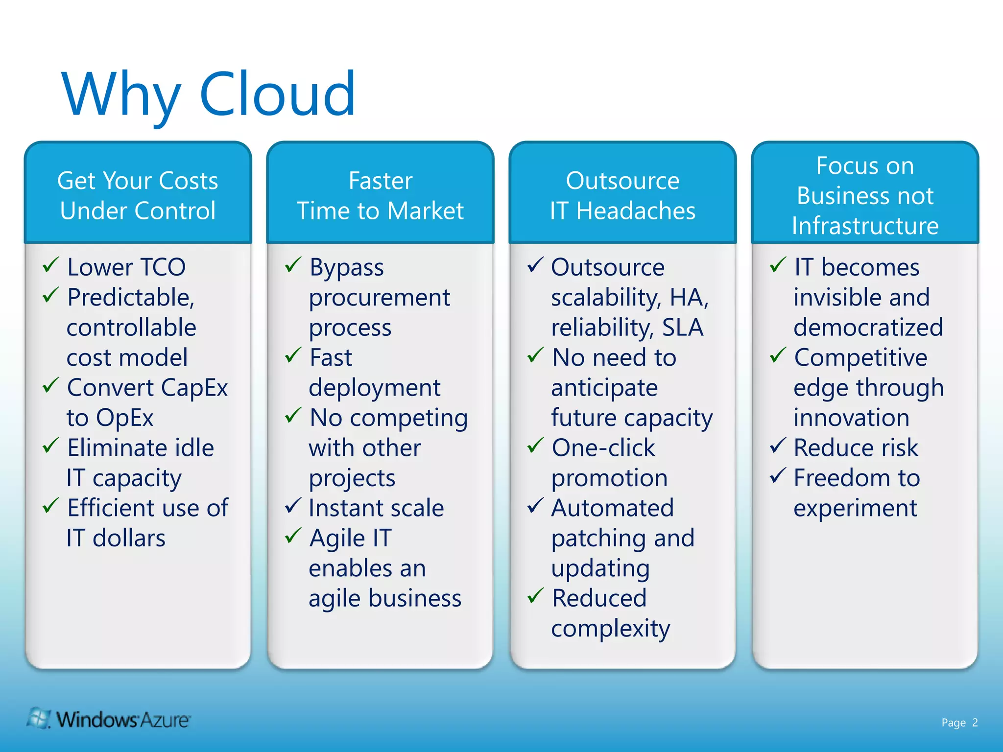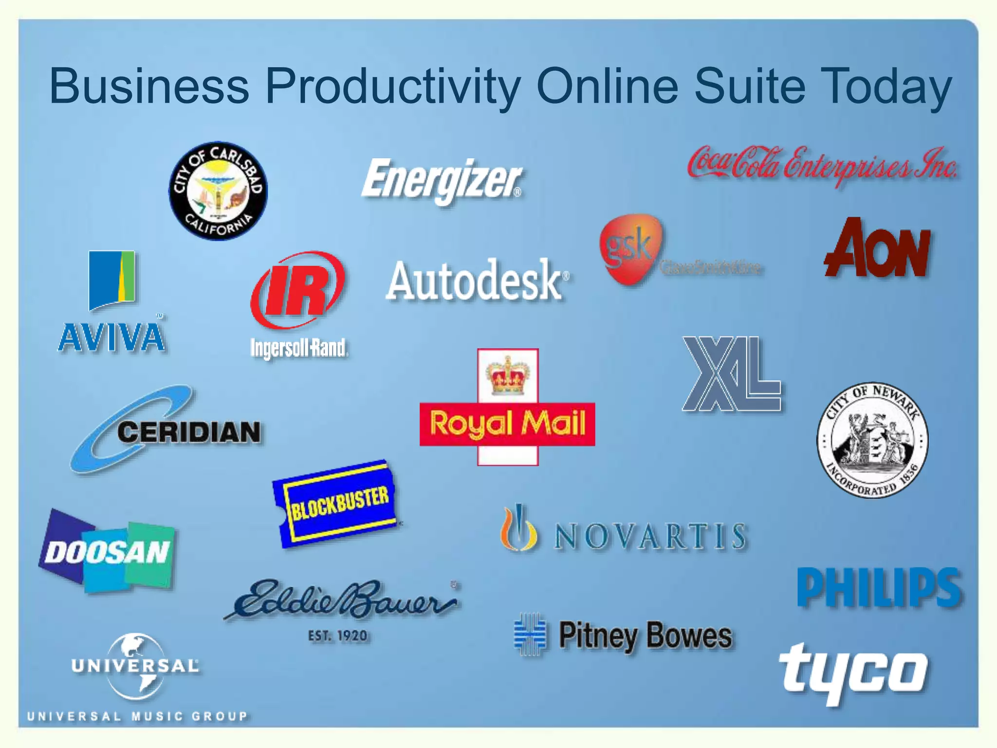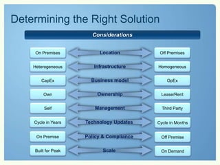 The document outlines the advantages of Microsoft cloud services, emphasizing cost control, increased agility, and reduced IT management burdens for businesses. Key features include scalability, efficient resource utilization, and a predictable cost model through cloud solutions. It also highlights various customer testimonials showcasing significant cost savings and operational improvements achieved by transitioning to Microsoft Online Services.