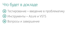 Документ обсуждает инструменты тестирования Microsoft в облаке и локально, включая возможности платформы Visual Studio. Основное внимание уделяется мониторингу, разработке и управлению проектами, а также использованию искусственного интеллекта для улучшения приложений. Также представлены детали о нагрузочном тестировании и поддержке пользователей через Application Insights.