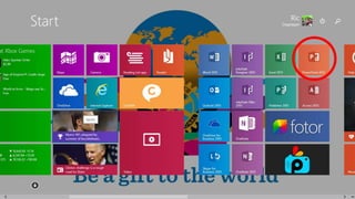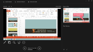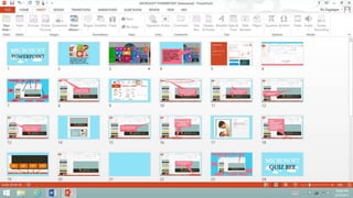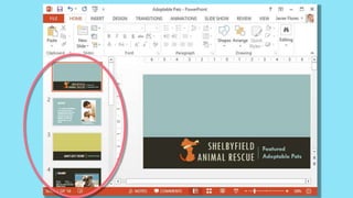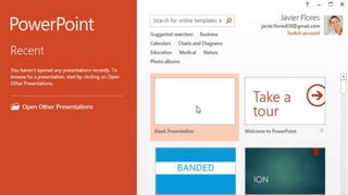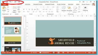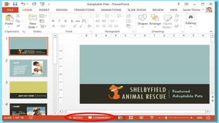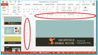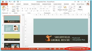 The document discusses Microsoft PowerPoint 2013 presentation software. PowerPoint allows users to create dynamic slideshows incorporating animation, narration, images, and videos. When first opened, PowerPoint displays a Start Screen where users can create new presentations or access recently edited ones. The document then explains various interface elements like the Quick Access Toolbar, Ribbon, ruler, slide pane, and navigation pane which allow viewing and editing slides. It provides instructions on adjusting the slide view and describes scroll bars and zoom controls for panning and zooming the slide view.