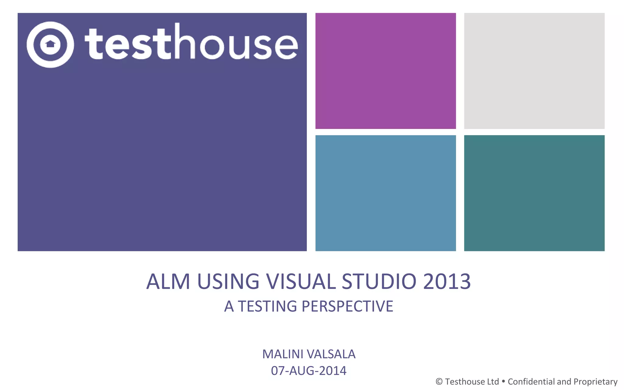 The document outlines the capabilities and benefits of using Application Lifecycle Management (ALM) with Visual Studio 2013, covering tools like Microsoft Test Manager and Team Web Access. It emphasizes the importance of flexible environments, integration of testing processes, and effective collaboration within teams to enhance software quality. Additionally, it lists various functionalities such as test automation, reporting, and project management to streamline the software development lifecycle.