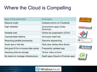 Microsoft Windows Azure is a cloud computing platform that provides infrastructure as a service, platform as a service and software as a service. It allows developers to build and host applications and services through Microsoft's global network of data centers. Key components of Windows Azure include Web Roles, Worker Roles, Storage, SQL Azure database, Cloud Fabric for automatic scaling and failover, and development tools to facilitate building applications for the cloud. The document provides an overview of these services and components and how developers can get started using Windows Azure.