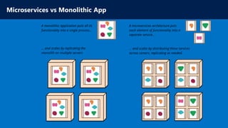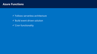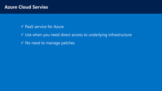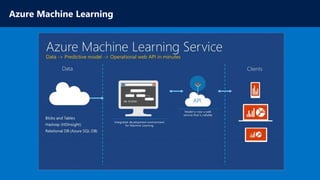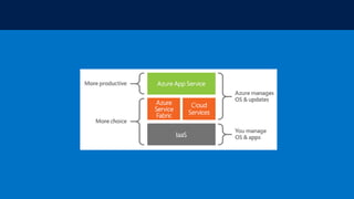 The document discusses various Microsoft Azure services, including Azure App Service, Azure Machine Learning, and microservices in Azure. It highlights Azure's capabilities for hosting applications, automating business logic, and providing backend services for both web and mobile apps. The author's expertise is also mentioned within the context of a technical community, showcasing a personal blog for further insights.