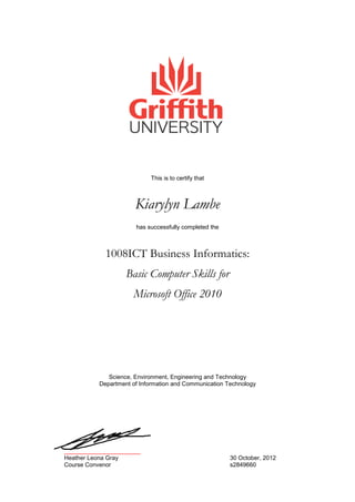 Kiarylyn Lambe has successfully completed the 1008ICT Business Informatics: Basic Computer Skills for Microsoft Office 2010 course on October 30, 2012. The course was convened by Heather Leona Gray of the Department of Information and Communication Technologies within the Science, Environment, Engineering and Technology faculty.