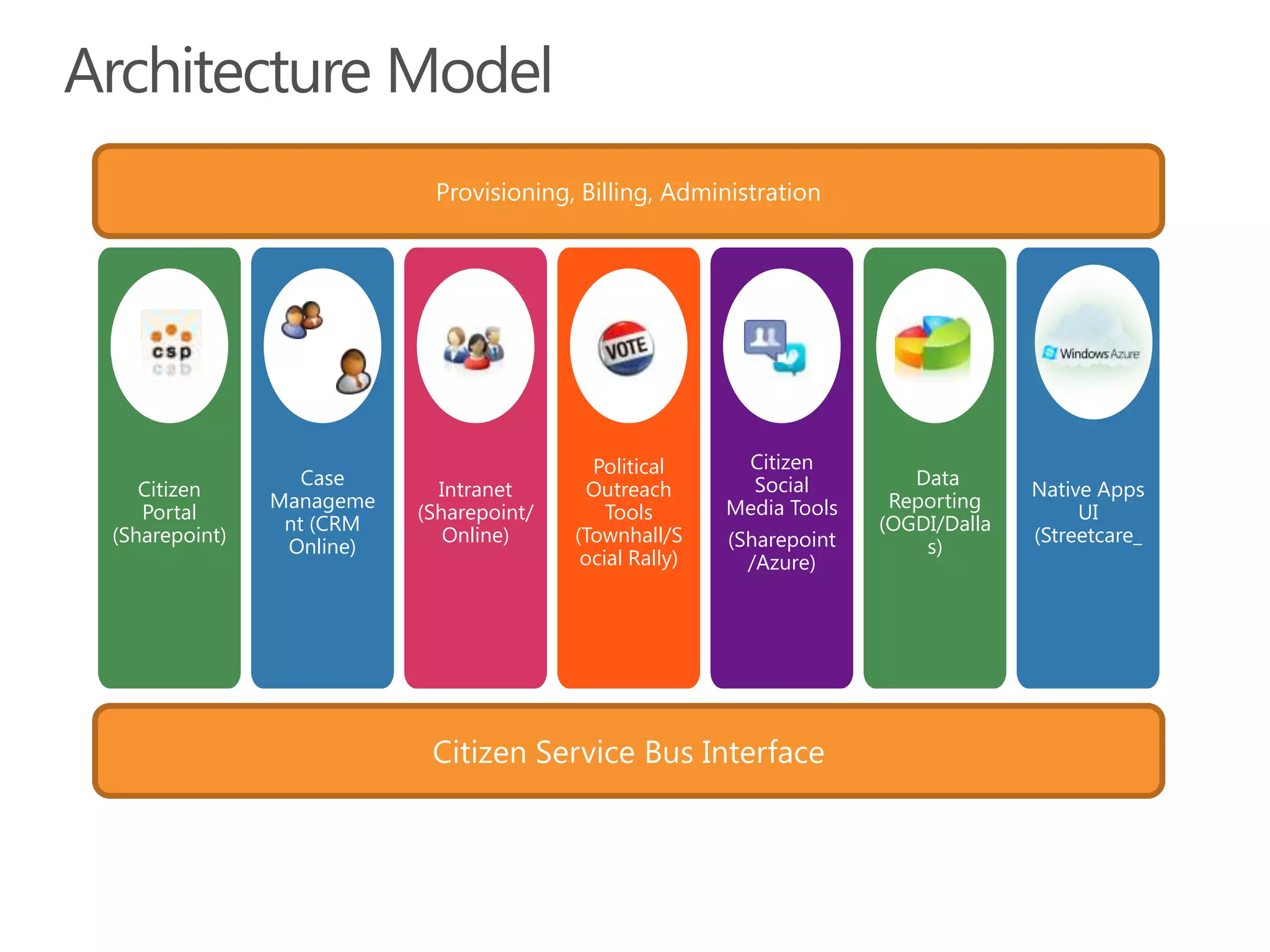 The document describes a citizen service platform architecture that provides various digital services to citizens through a hybrid public/private cloud model. Key components include a citizen portal, case management system, document management, social media tools, mobile apps, and a marketplace for third-party apps. It outlines the user flows for common processes like reporting issues, managing permits, and reviewing data.