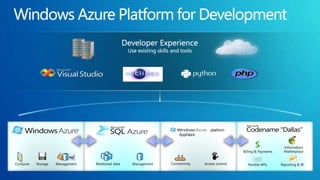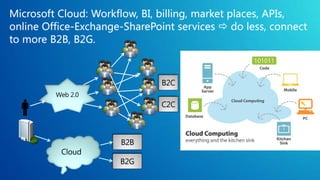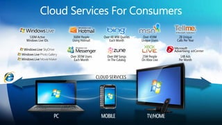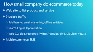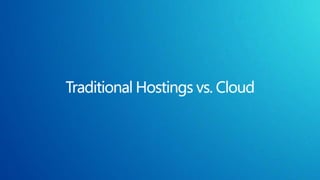 The document discusses various hosting options for ecommerce websites including shared hosting, virtual private servers, dedicated servers, clustered servers, and public cloud. Each option is described in terms of cost, control/reliability, skills required, and other pros and cons. The document also discusses Microsoft's cloud platform and provides an example TCO analysis comparing on-premises hosting to hosting on Microsoft Azure.