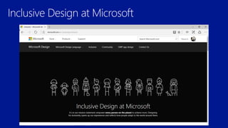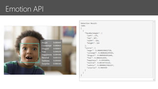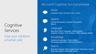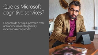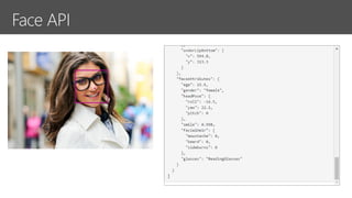The document discusses Microsoft Cognitive Services, highlighting their adaptability to various platforms, extensive documentation, and community support. It includes examples of various APIs such as Computer Vision, Emotion API, and Language Understanding services. Additionally, it touches on the importance of inclusive design, emphasizing that needs can change based on individual circumstances.