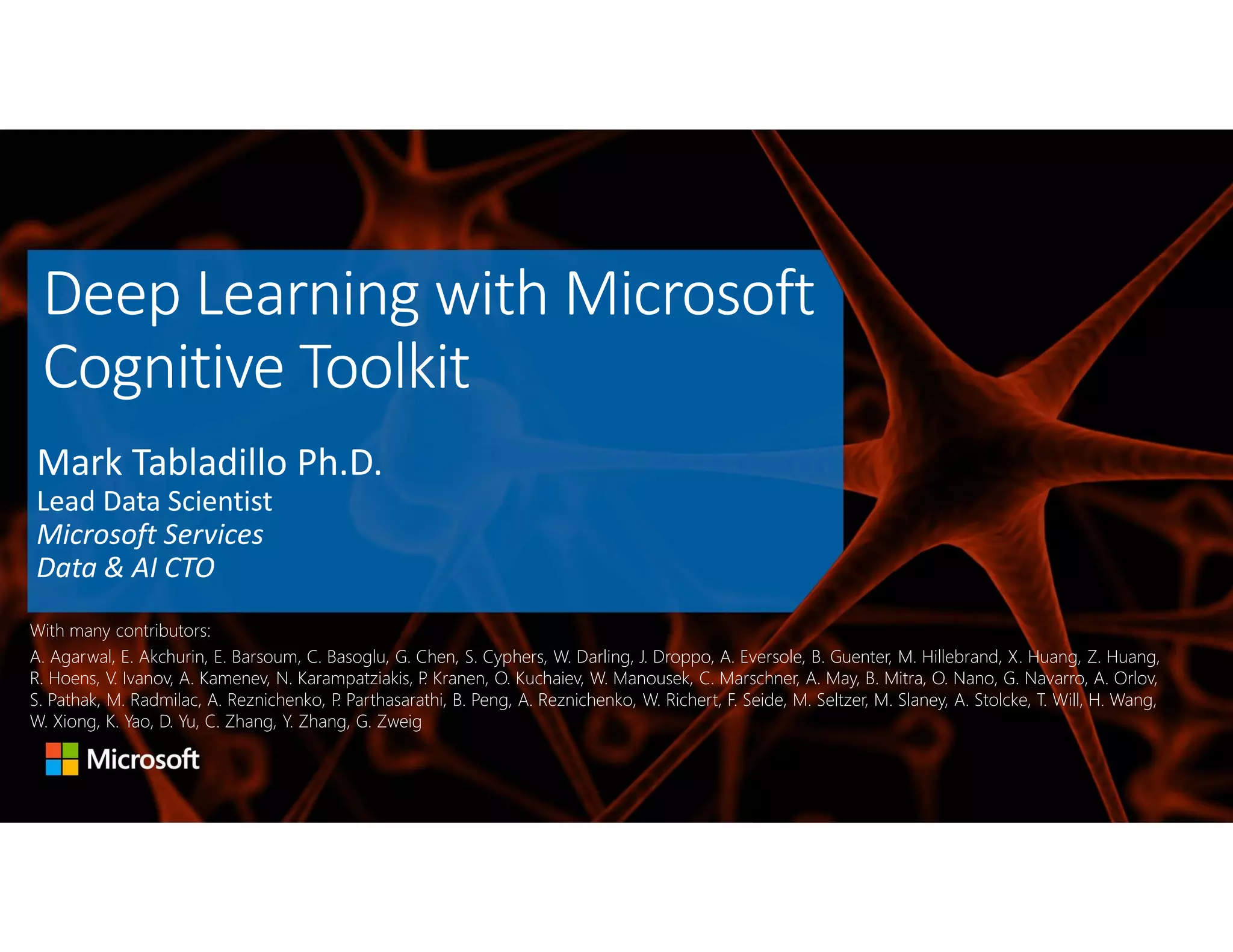 The document describes the Microsoft Cognitive Toolkit (CNTK), an open-source deep-learning toolkit that excels in scalability and performance across various platforms. It highlights CNTK's key features, achievements in speech recognition, and competitive benchmarks against other technologies like TensorFlow. Additionally, it outlines potential applications, including Microsoft's AI services, and includes mentions of code availability and Jupyter Python demos.
