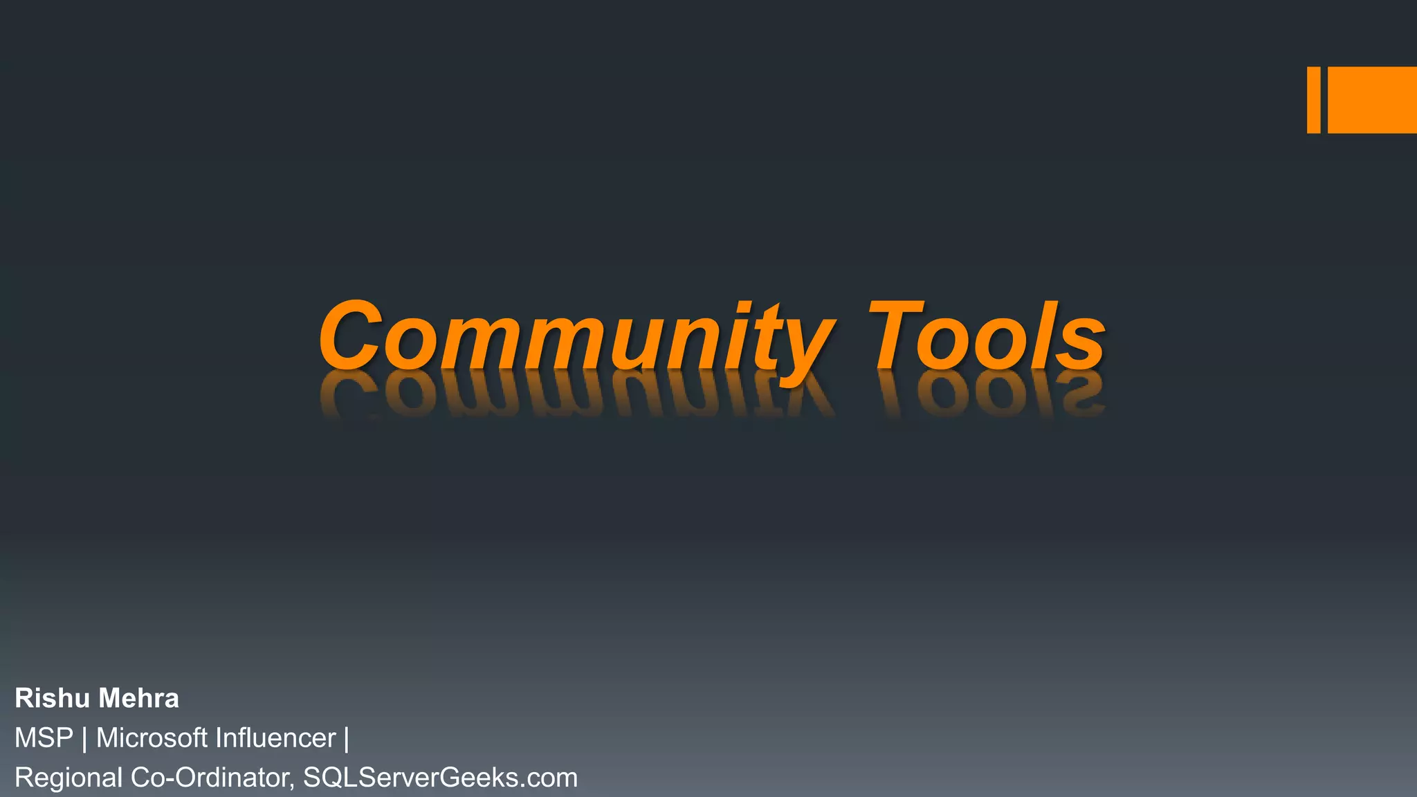 This document lists various community tools and resources provided by Microsoft for developers and users, including forums, blogs, user groups for networking and collaboration, channels for rich media, social bookmarking sites, open source projects, code snippets, webcasts, virtual labs, beta programs, product communities, free software programs, the Microsoft MVP program, and Rishu Mehra's contact information and social media profiles.