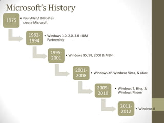 Microsoft has grown significantly since its founding in 1975. It began by partnering with IBM and launched its first Windows operating system in 1982. Major releases included Windows 95, 98, 2000, XP, Vista, 7, and 8. In 2012, Microsoft's top partners were Avanade, HP, and Catapult Systems. Microsoft seeks to grow its market share in smartphones and cloud computing while expanding services around popular franchises like Halo and partnerships like Nokia. It remains the dominant player in desktop operating systems but faces strong competition from Android and iOS in mobile.
