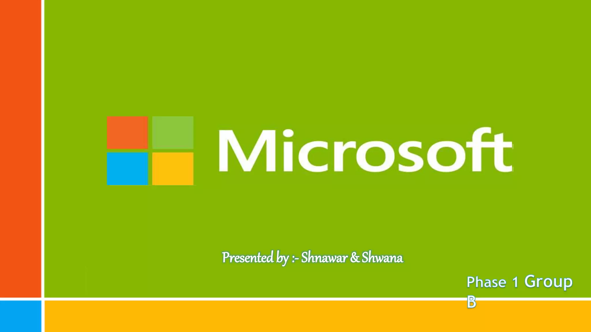 Microsoft Corporation is a multinational technology company founded in 1975 by Bill Gates and Paul Allen. It develops, manufactures, licenses, and supports computer software, consumer electronics, personal computers, and related services. Microsoft had over $62 billion in revenue in 2010 and has over 90,000 employees across over 100 subsidiaries worldwide. It is headquartered in Redmond, Washington.