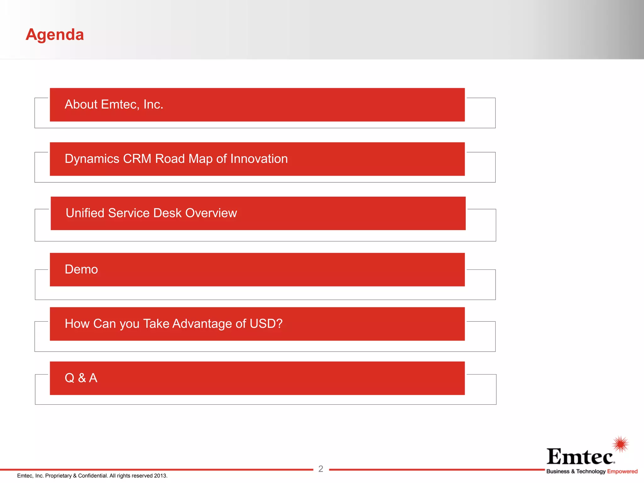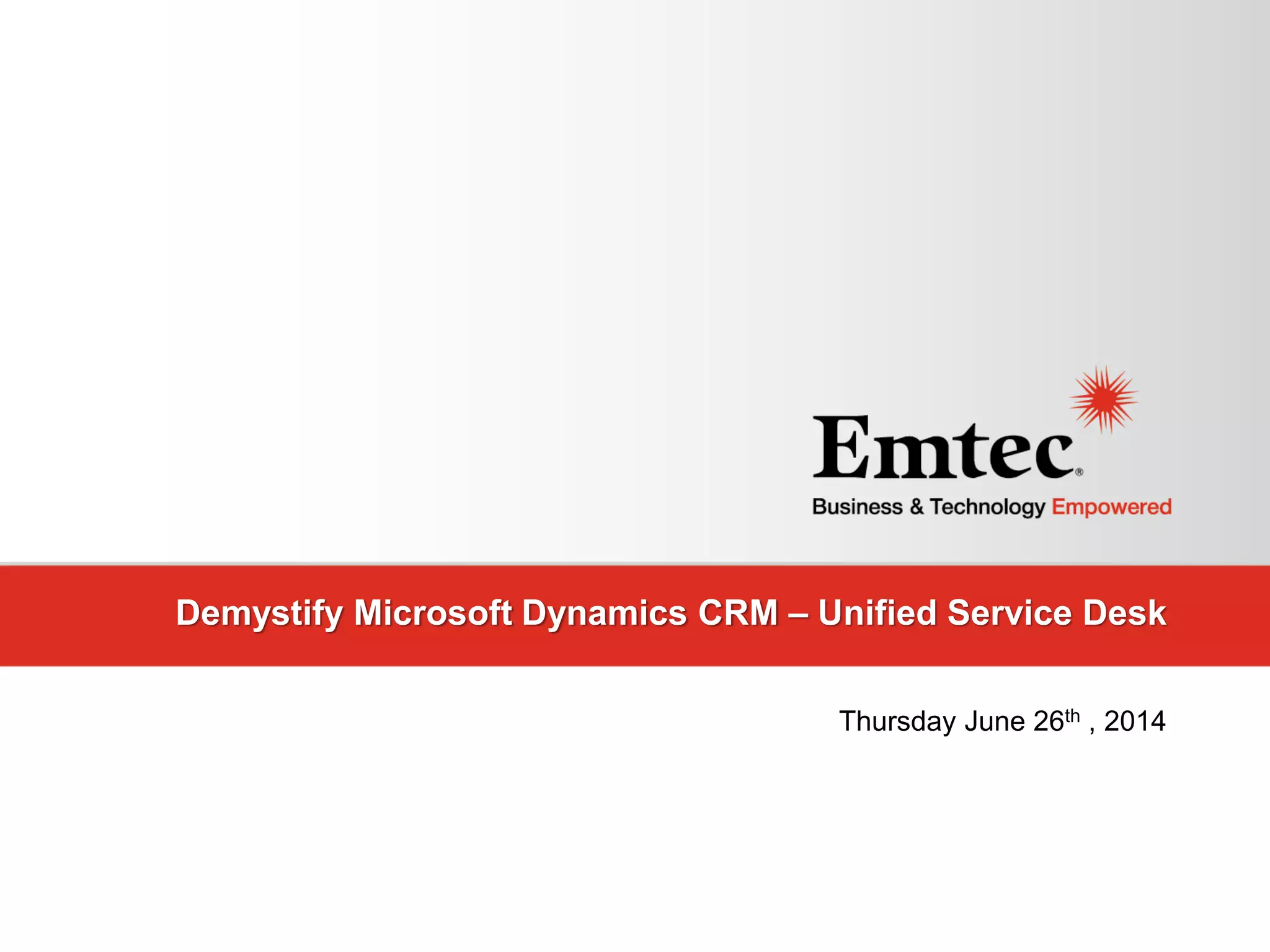Emtec presented on Microsoft Dynamics CRM's Unified Service Desk. They discussed the new desktop application that supports call centers with high inbound inquiries. It is compatible with both CRM Online and on-premise implementations and is centrally managed from Dynamics CRM. The demo showed the powerful agent desktop that improves key metrics and allows agents to handle multiple customer sessions simultaneously. Pricing details were also provided.