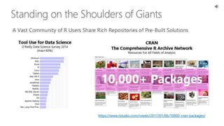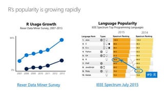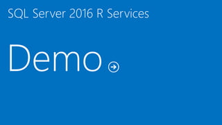 The document discusses machine learning with SQL Server 2016 and R Services. It provides an overview of machine learning, R programming language, and the challenges of using R with SQL databases prior to SQL Server 2016. SQL Server 2016 introduces R Services, which allows running R code directly in the database for high performance, scalable machine learning. R Services integrates R with SQL Server through in-database deployment and parallel processing capabilities. This eliminates data movement and scaling issues while leveraging existing R and SQL skills.