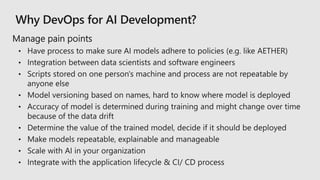 The document discusses the integration of AI into Microsoft's technology platforms to enhance productivity and drive innovation. It outlines the AI DevOps lifecycle, emphasizing model development, deployment, and monitoring within an intelligent cloud and edge framework. Key components include automated machine learning capabilities, popular frameworks for deep learning, and tools to streamline data science processes.