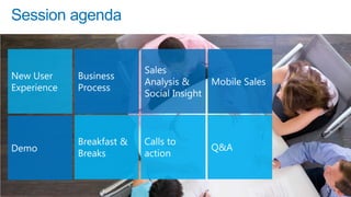 The session agenda document discusses how Microsoft Dynamics CRM can help businesses adapt to changing buyer behaviors and expectations. It summarizes how Dynamics CRM provides tools to personalize experiences across marketing, sales, and customer service. These include social networking integrations, mobile access, process automation, and data/insights tools to understand customers throughout their journey. Case studies show Dynamics CRM helping businesses increase sales volumes by over 150% and reduce customer support times by 75%.