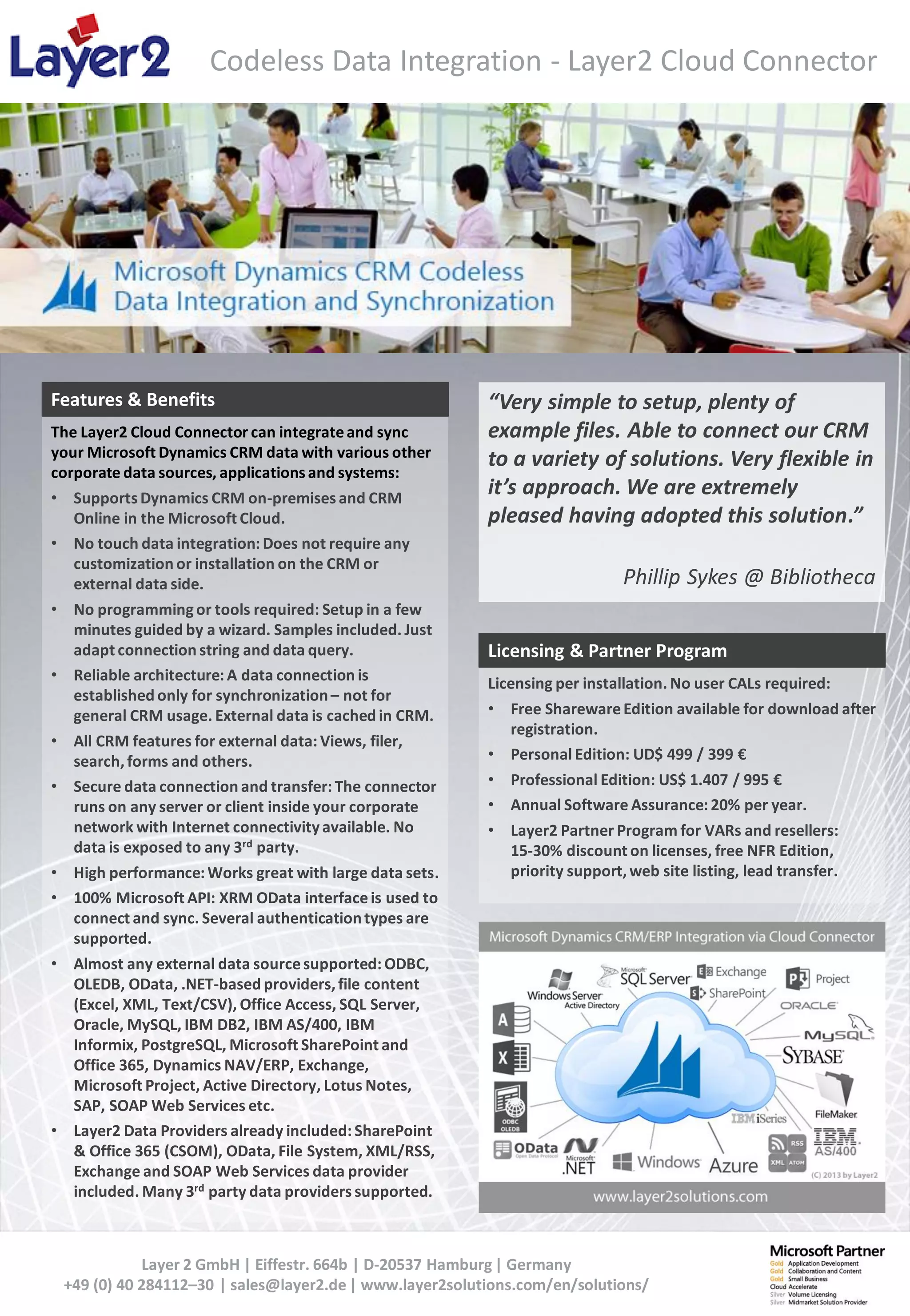 The Layer2 Cloud Connector integrates Microsoft Dynamics CRM with various corporate data sources and systems without requiring programming or extensive setup. It supports both on-premises and online CRM versions, ensuring secure and high-performance synchronization of external data. Licensing options include a free shareware edition, personal and professional editions, along with a partner program offering discounts and support.
