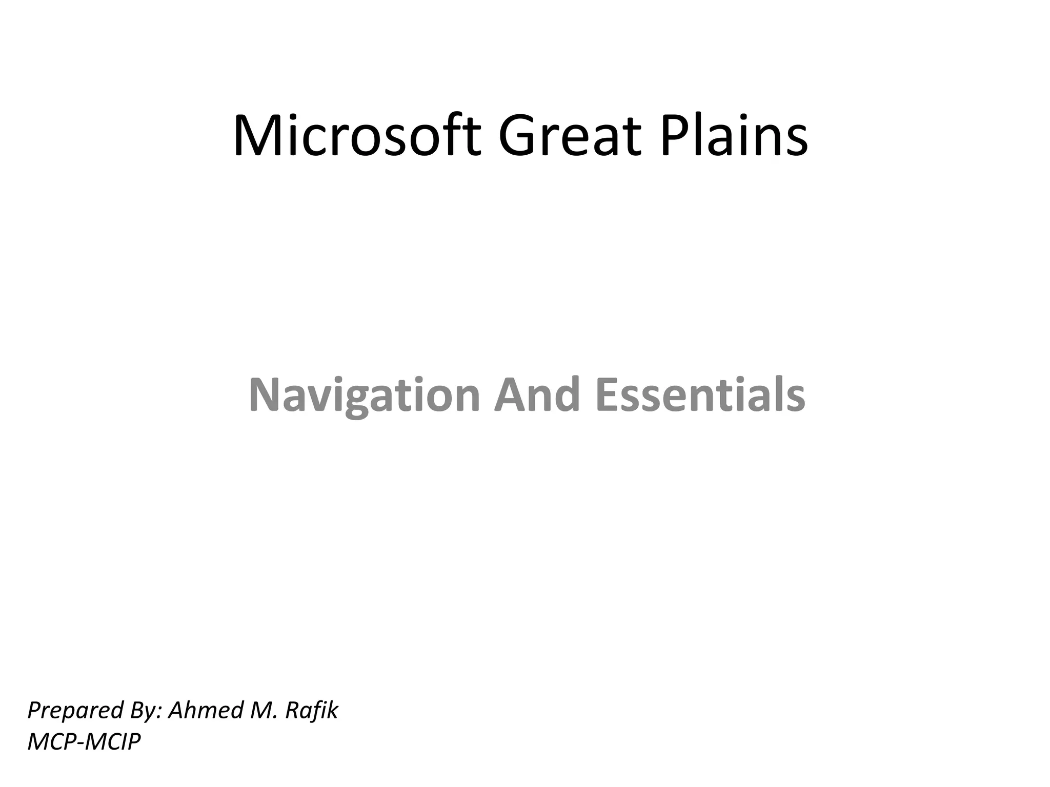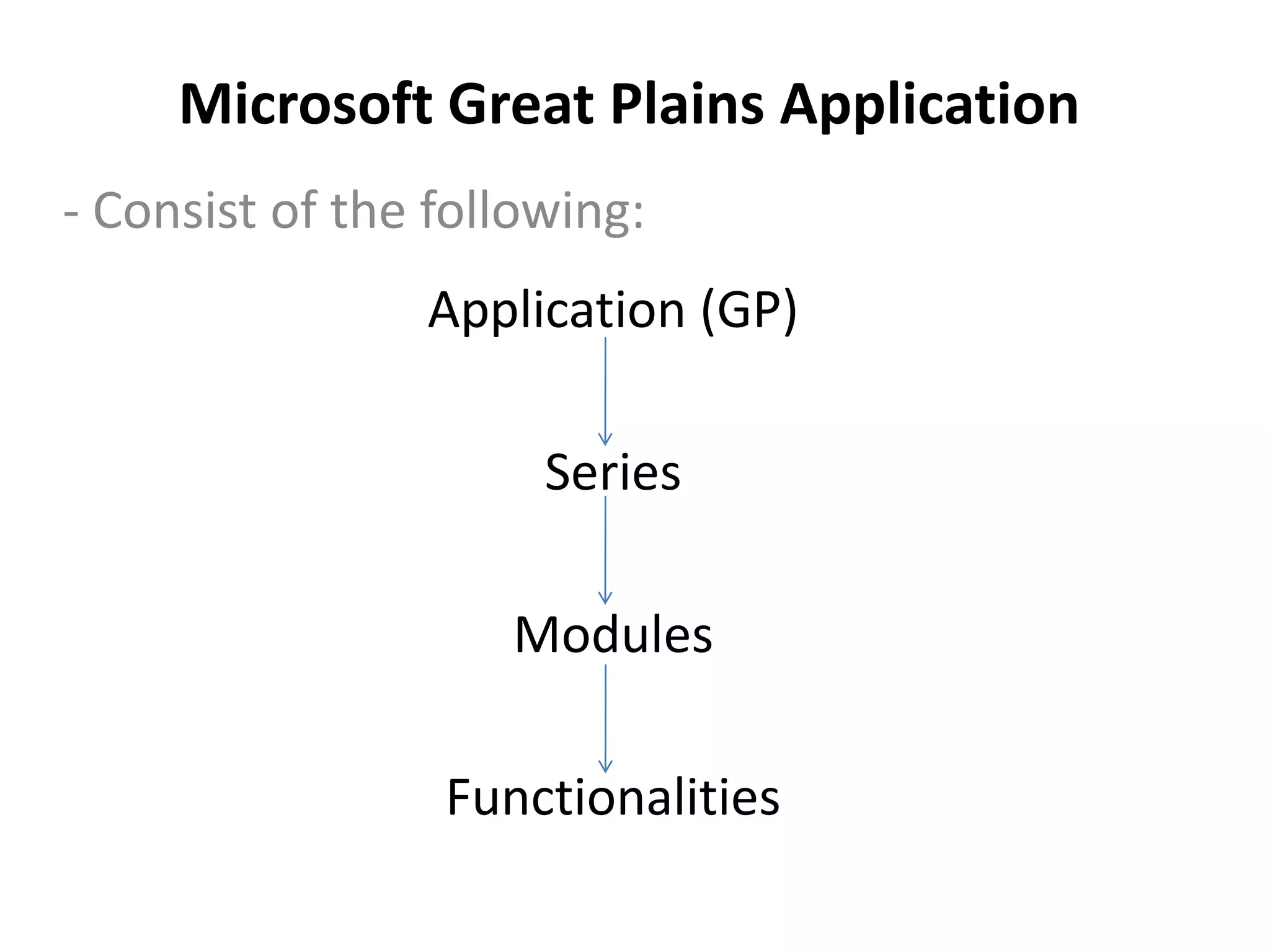 Microsoft Great Plains is an ERP application consisting of modules for financials, sales, purchasing, and inventory across different series. It provides functions for general ledger, analytical accounting, bank reconciliation, and more. Navigation features include a menu bar, navigation pane, role-based home page, and options for smart lists, inquiries, reports, reminders, tasks and help. Reports and other outputs are generated from transactional inputs processed through the application's modules.