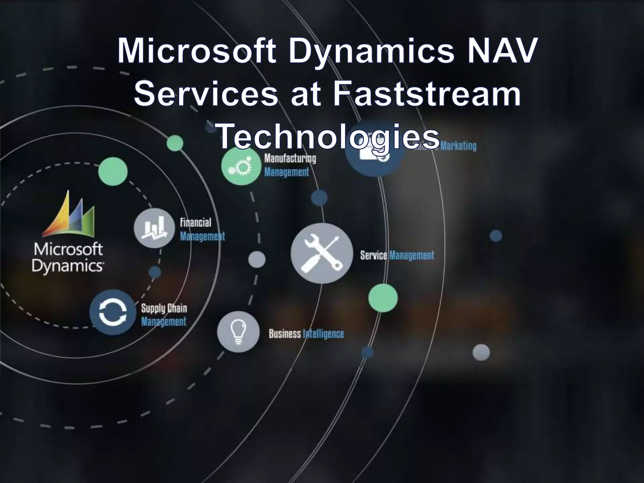 Microsoft Dynamics NAV is an ERP solution designed for small and medium businesses that provides tools to simplify business processes and gain better control. It has an intuitive interface based on Microsoft Office and open architecture for fast implementation. Dynamics NAV can automate key processes, improve efficiency, and provide role-based data views. FastStreamTech offers services including implementation, customization, integration, and support for Dynamics NAV.