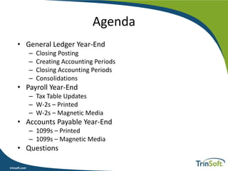 This document outlines the year-end processing procedures for general ledger, payroll, and accounts payable in Dynamics NAV. Key topics include closing accounting periods, tax updates, and generating W-2 and 1099 forms, with specific steps for each area. Additionally, it emphasizes proper setup and documentation requirements for accurate year-end financial reporting.