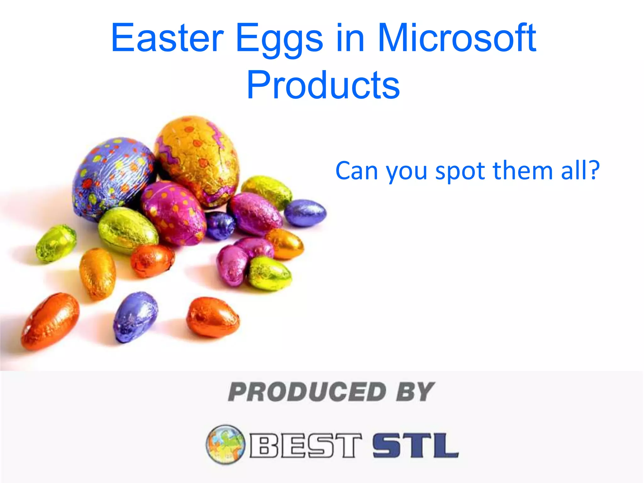 This document lists various Easter eggs hidden in past versions of Microsoft software products such as Windows, Word, Excel, and Access. Some examples include accessing a hidden screensaver of a 3D teapot model in Windows 95, viewing random quotes in older Office versions, and triggering a "Hall of Tortured Souls" screen in Excel 95 by selecting specific cells. The Easter eggs were hidden messages or jokes left by developers to be discovered by users.
