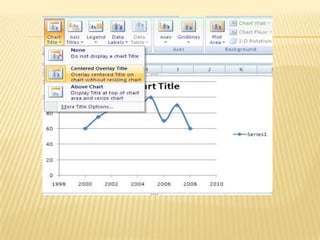 Координатын муж батэнхлэгийн нэрийг оруулах 1. CHART TITLE командын хэрэглүүр дээр дарж координатын мужийн нэрийг байрлуулах сонголтыг хийнэ. Нэрийн дүрсийг форматлах тохиолдолд MORE TITLE OPTIONS командыг сонгоно. CHART TITLE гэж гарч ирсэн текстийн оронд тухайн графикийн нэрийг бичиж өгнө. Жишээ нь: Хичээлийн үзүүлэлт - 15.