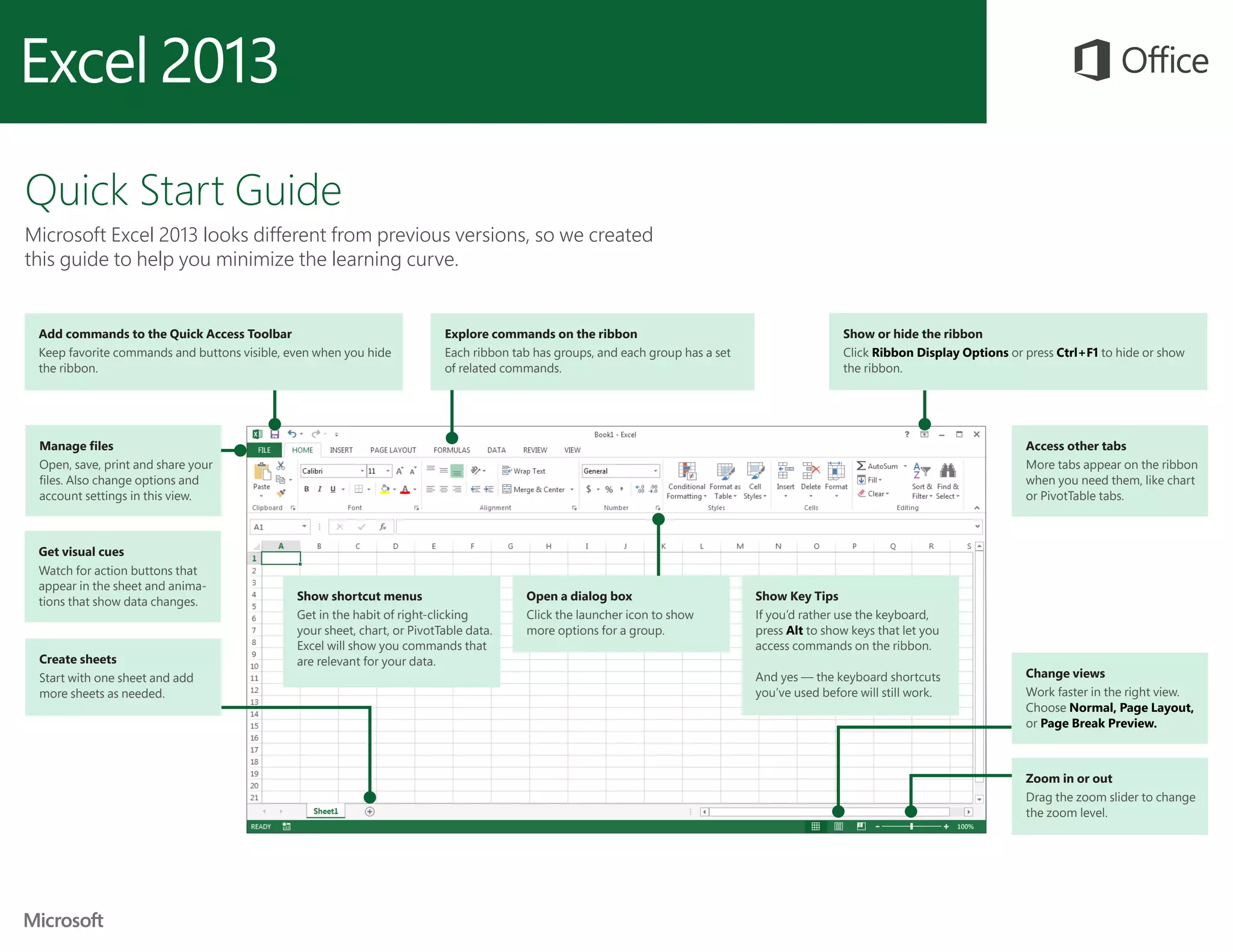 This document provides tips for getting started with Excel 2013, including how to find common commands that have moved from previous versions and how to work with others who don't have Excel 2013. It recommends exploring the ribbon to see changes, lists where to find frequently used tools, and explains how to enable advanced features and share files across versions.