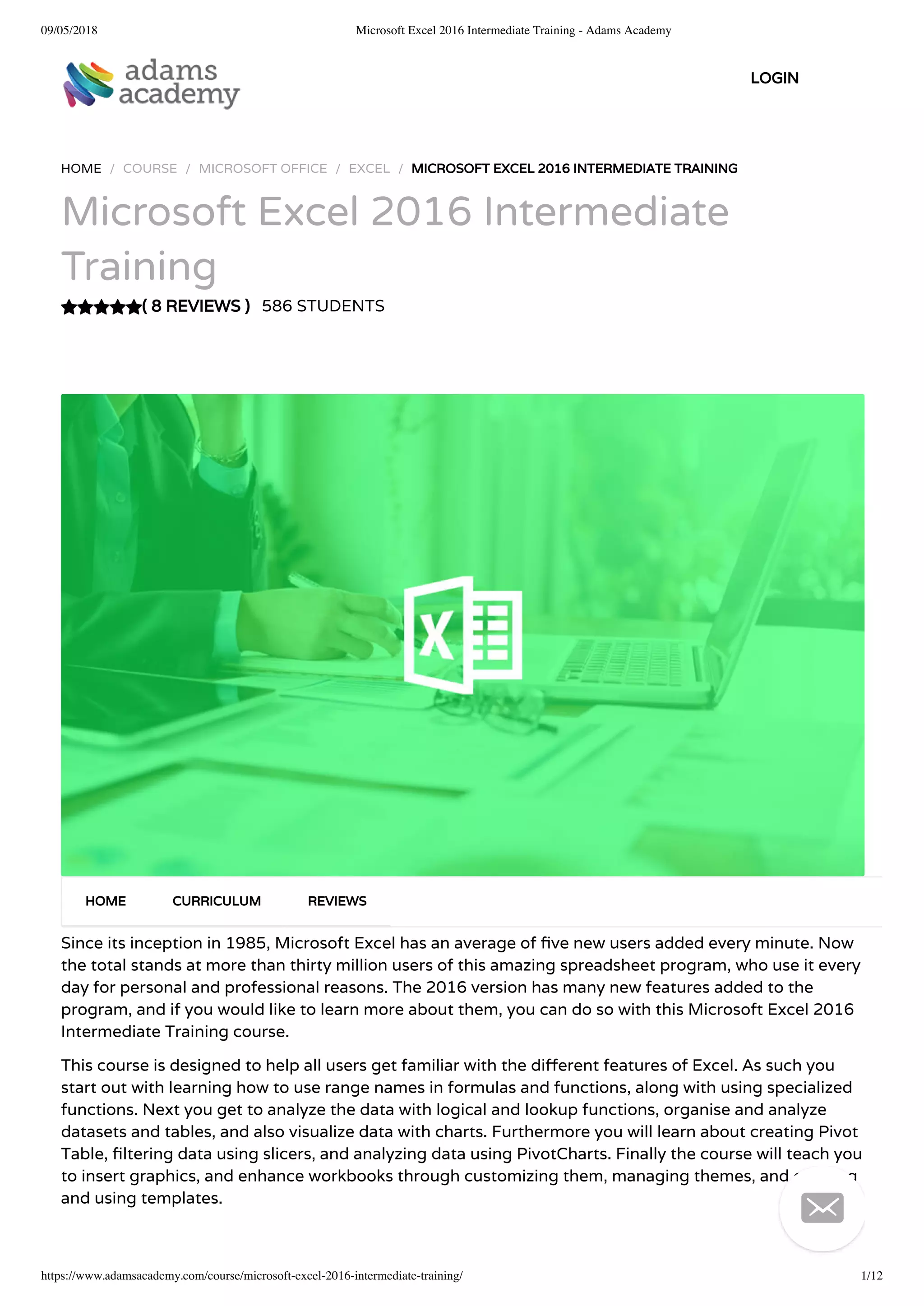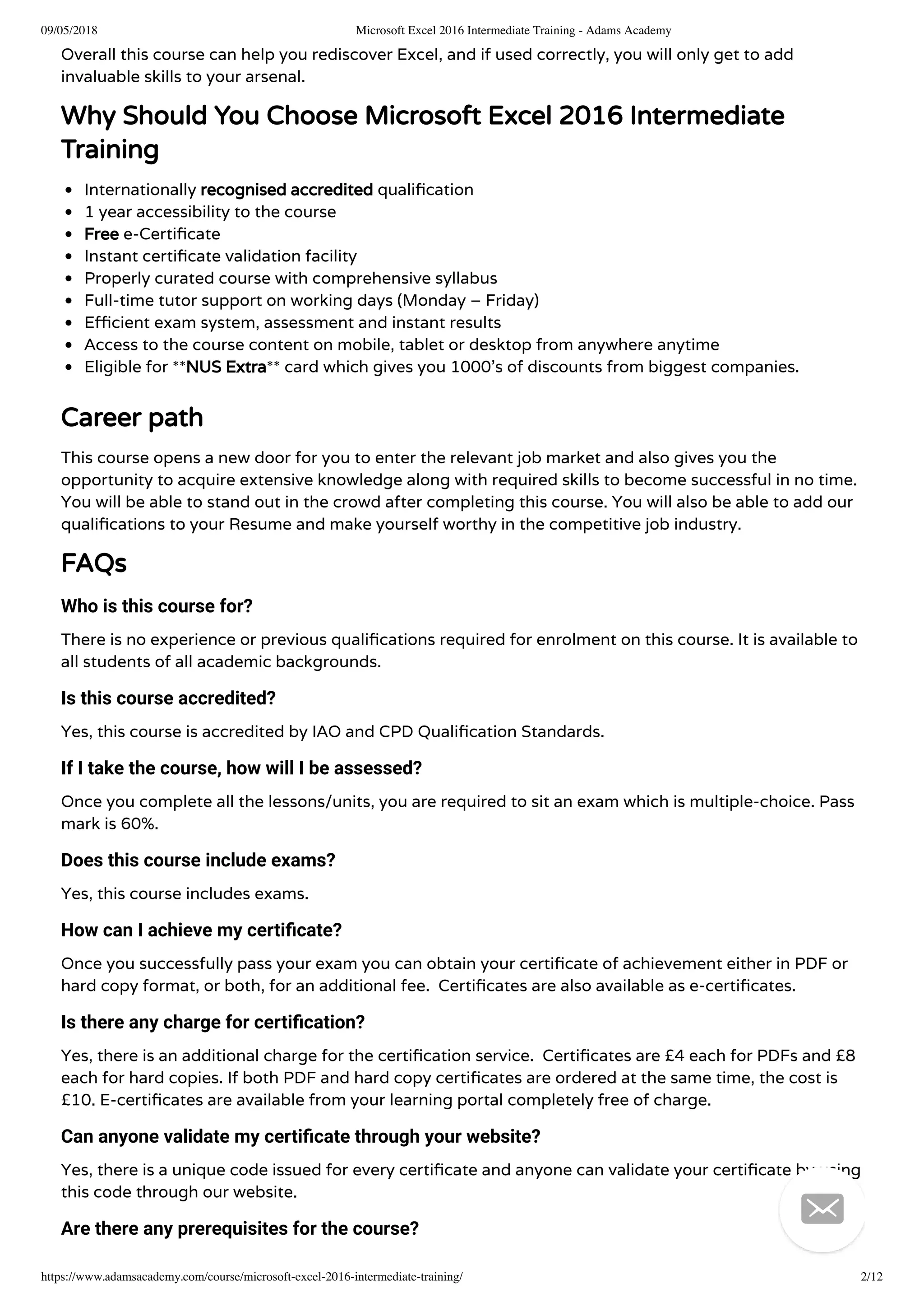 The Microsoft Excel 2016 Intermediate Training course by Adams Academy is designed to enhance user skills with various Excel features, including formulas, data analysis, pivot tables, and chart creation. The course is accessible to all users regardless of prior experience and offers a one-year access period, full tutor support, and accreditation. Upon completion, participants can obtain a certificate for an additional fee, helping them stand out in the competitive job market.