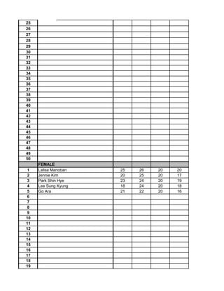 This document contains the grades of students from a school in their first quarter assessments. It includes the grades of 5 male students and 5 female students in their performance tasks, written works, quarterly assessments and total grades. The highest possible score is 100, with performance tasks worth 50%, written works 25% and quarterly assessments 25%. The top scoring student was Lee Jong Suk with a total grade of 100.