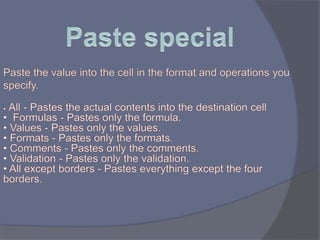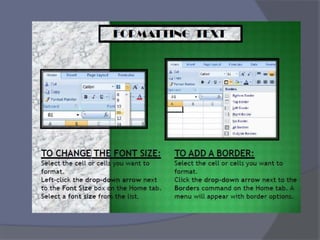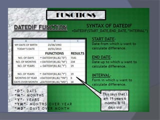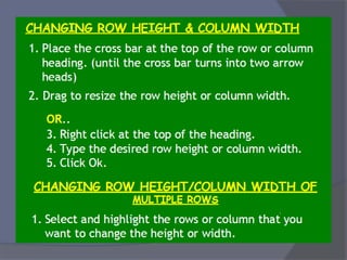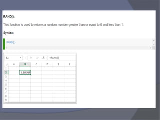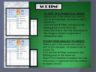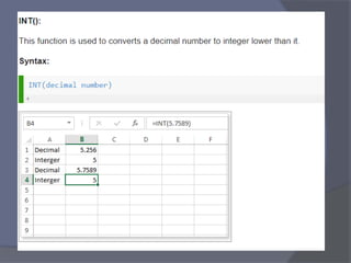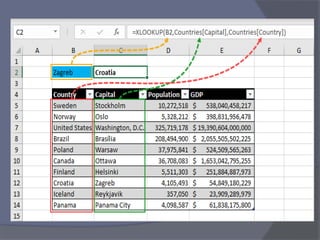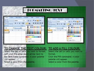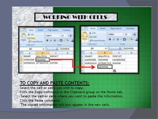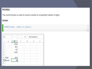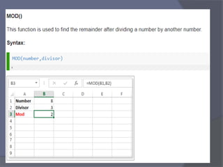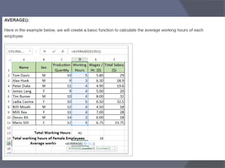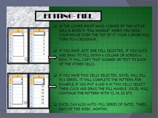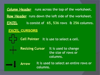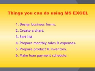 This document provides an overview of Microsoft Excel. It discusses that Excel is a spreadsheet application used to organize data into tables and perform calculations. Key points covered include: