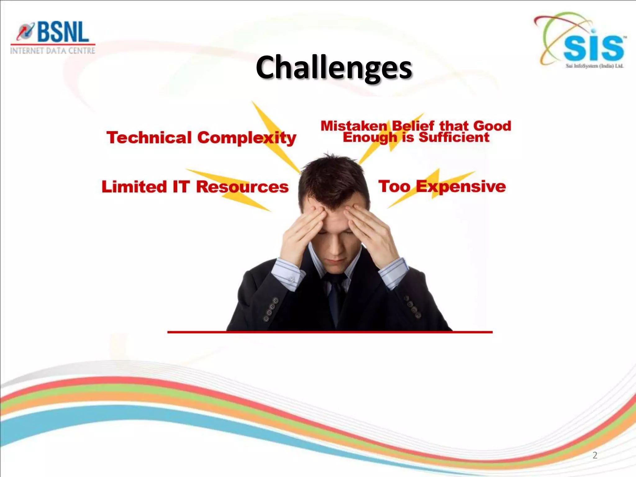 The document discusses the challenges faced by organizations in managing email services, including cost control, productivity, and security. It offers solutions for flexible access, enhanced communication, and continuous availability, along with key features such as email archiving, spam protection, and collaboration tools. The value additions emphasize a pay-as-you-use model, ensuring operational support and scalability without upfront capital investment.