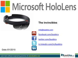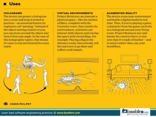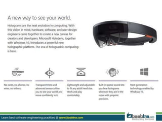 Microsoft HoloLens is the first holographic computer that does not require wires or connection to another device. It allows users to see holograms overlaid in the real world. HoloLens features see-through holographic lenses, sensors, and a processing unit that allows it to understand the environment and overlay holograms without wires in real-time. HoloLens uses augmented reality technology to supplement real-world environments with virtual elements and can enable entirely new ways of communication, creation and exploration through holograms.
