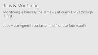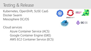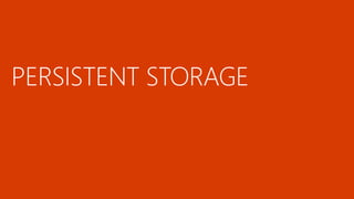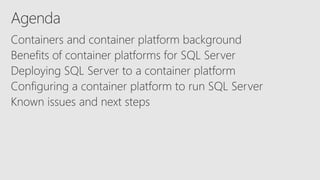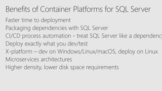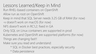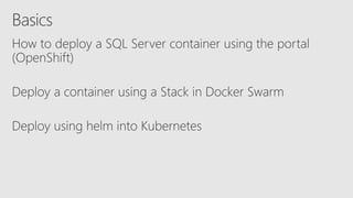 This document discusses containers and container technologies like Docker. It provides examples of real world uses of containers at Microsoft including for automated testing of SQL Server on Linux with hundreds of containers running tests simultaneously. It also covers container networking and how containers connect within and across hosts. Persistent storage options for containers using technologies like NFS, Ceph, Azure Blob storage are presented. Secret management in containers using an encrypted distributed store is also summarized.