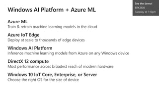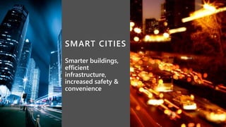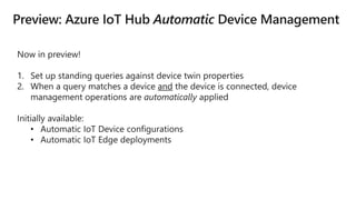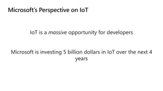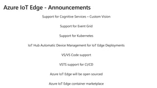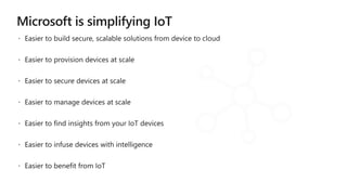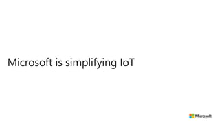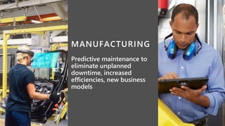 The document discusses Microsoft's IoT and edge computing solutions. It provides examples of how various companies are using IoT solutions to improve operations and save money. It also summarizes Microsoft's Azure IoT platform services including IoT Hub, IoT Central, IoT Edge, Azure Sphere, and Windows IoT. These services provide secure connectivity, management and analytics tools to connect, monitor and control IoT devices at scale.