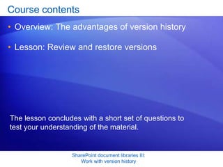 This 3-part training course teaches how to work with version history in SharePoint document libraries. It covers viewing and restoring previous versions, when versions are created, and the difference between major and minor versions. The goals are to learn how to check if a library stores versions, view version history, restore old versions, and understand version numbering and creation.