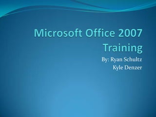 This document provides an overview of training for Microsoft Office 2007, focusing on the main applications of Word, Excel, and PowerPoint. It discusses the general navigation features of Office 2007 and how to perform basic document creation and formatting tasks in each program, such as opening and closing documents, using tabs and buttons, and inserting pictures, charts, graphs, animations, and sounds. The training session aims to cover the essential features of the three main Office applications and leave time at the end for questions.