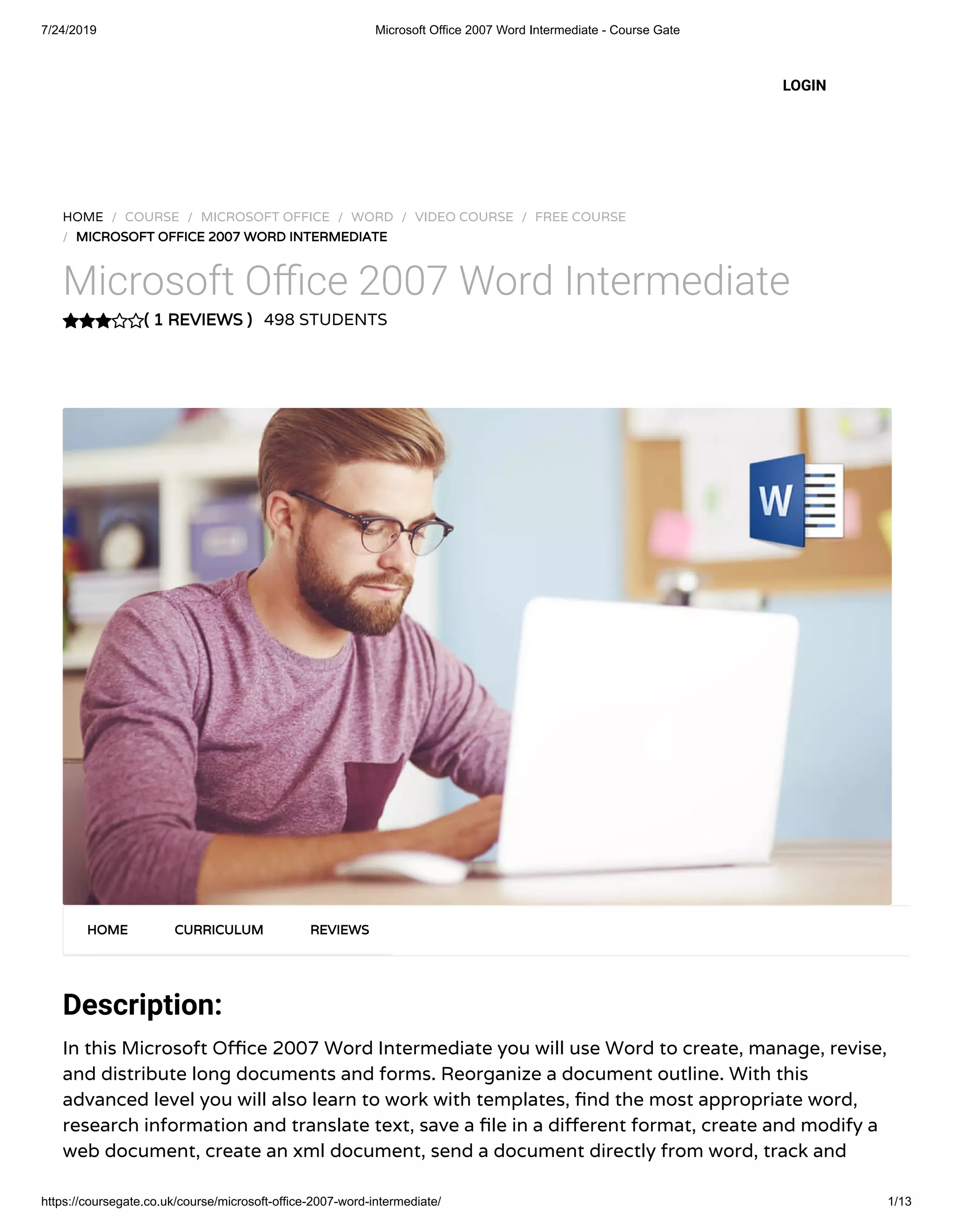 The Microsoft Office 2007 Word Intermediate course teaches users how to create, manage, revise, and distribute long documents and forms, emphasizing advanced skills such as using templates, tracking changes, and mail merge. It is designed for learners aged 16 and over from any academic background, with no prior qualifications required. Assessment involves answering three written assignment questions instead of traditional exams.