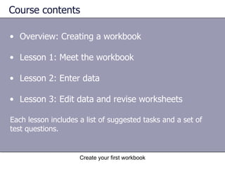 This document provides a summary of a 3-lesson Microsoft Excel training course for creating a workbook. The lessons cover creating a new workbook, entering and editing data, and revising worksheets. Key points covered include creating and navigating worksheets, entering text, dates, numbers and using auto-fill, editing data, inserting and deleting columns and rows, and removing cell formatting. The goal is for students to learn basic Excel skills to enter and manage data.