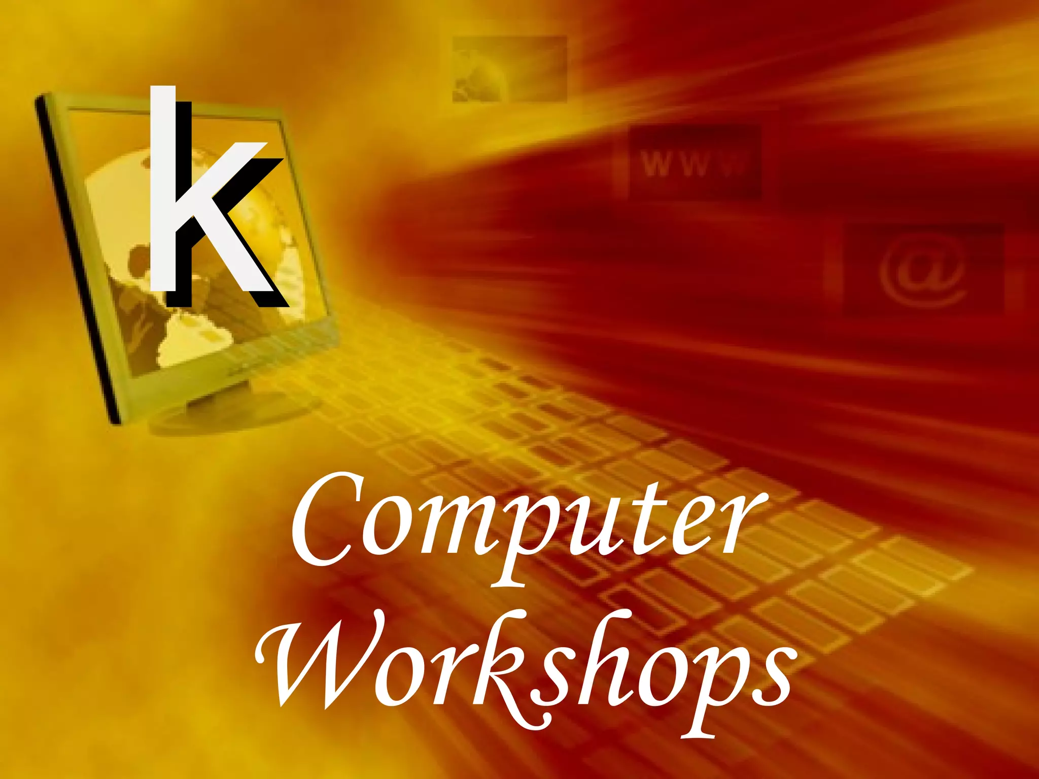 This document provides an overview of the topics and functions that will be covered in a computer workshop on Microsoft Excel, including navigating the Excel interface, creating basic formulas, using functions, sorting and filtering data, inserting charts and graphics, and printing worksheets.