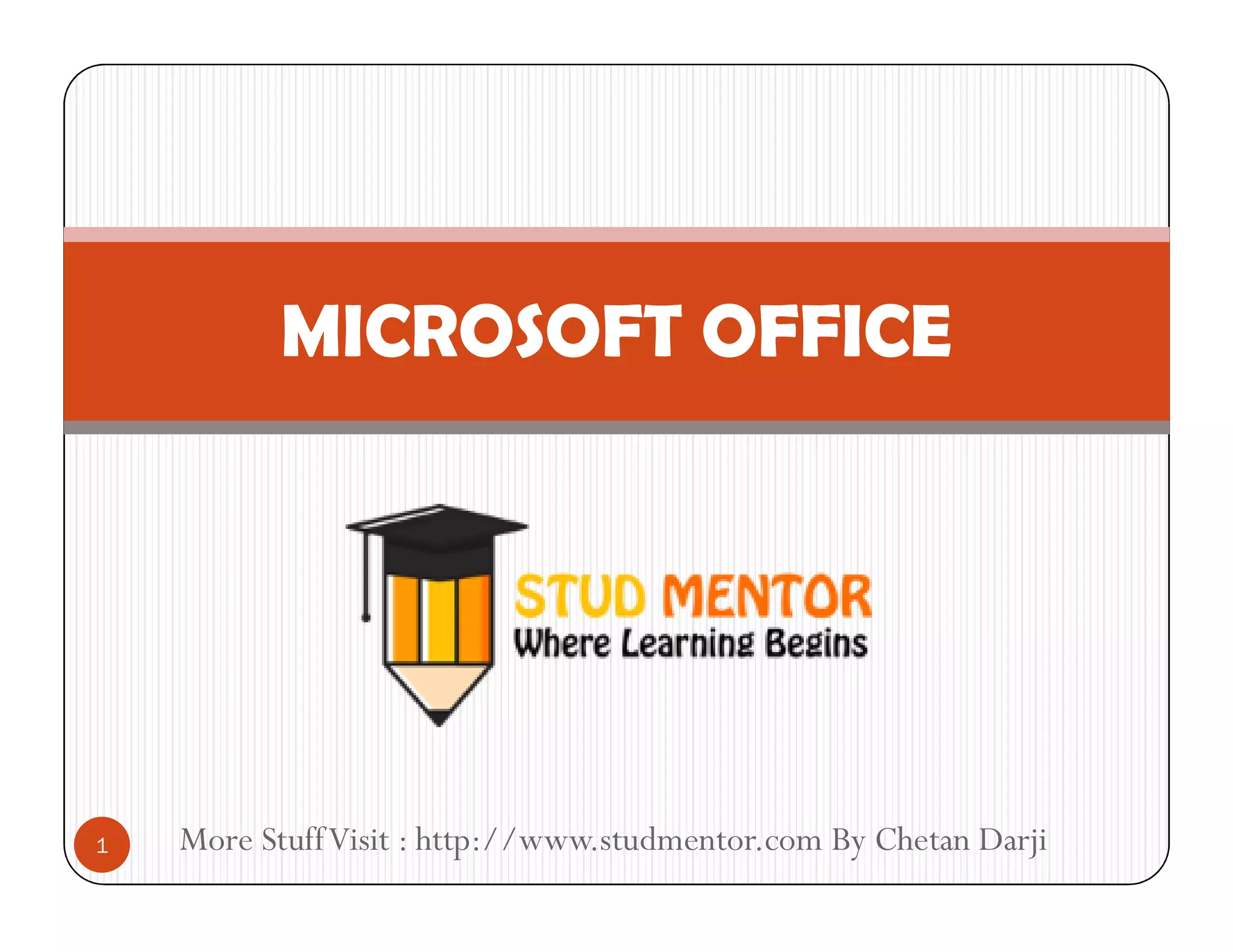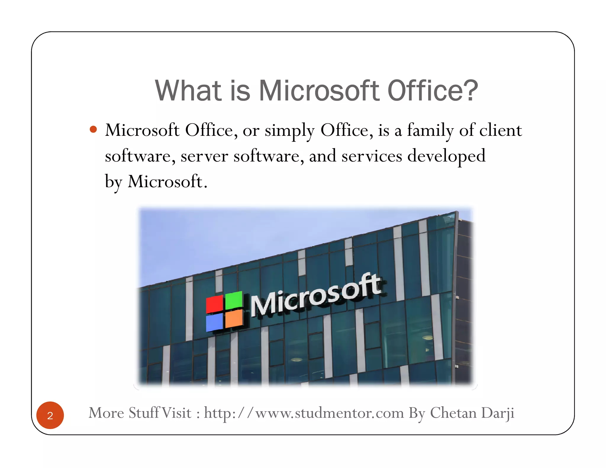 Microsoft Office is a suite of applications developed by Microsoft that includes Word, Excel, PowerPoint, and Outlook. It was first announced in 1988 and contained Word, Excel, and PowerPoint. Over the years, Office applications have become more integrated with shared features. Microsoft Office is used primarily for office and business tasks like creating documents, spreadsheets, presentations, and emailing. It automates manual office work through these purpose-built applications.