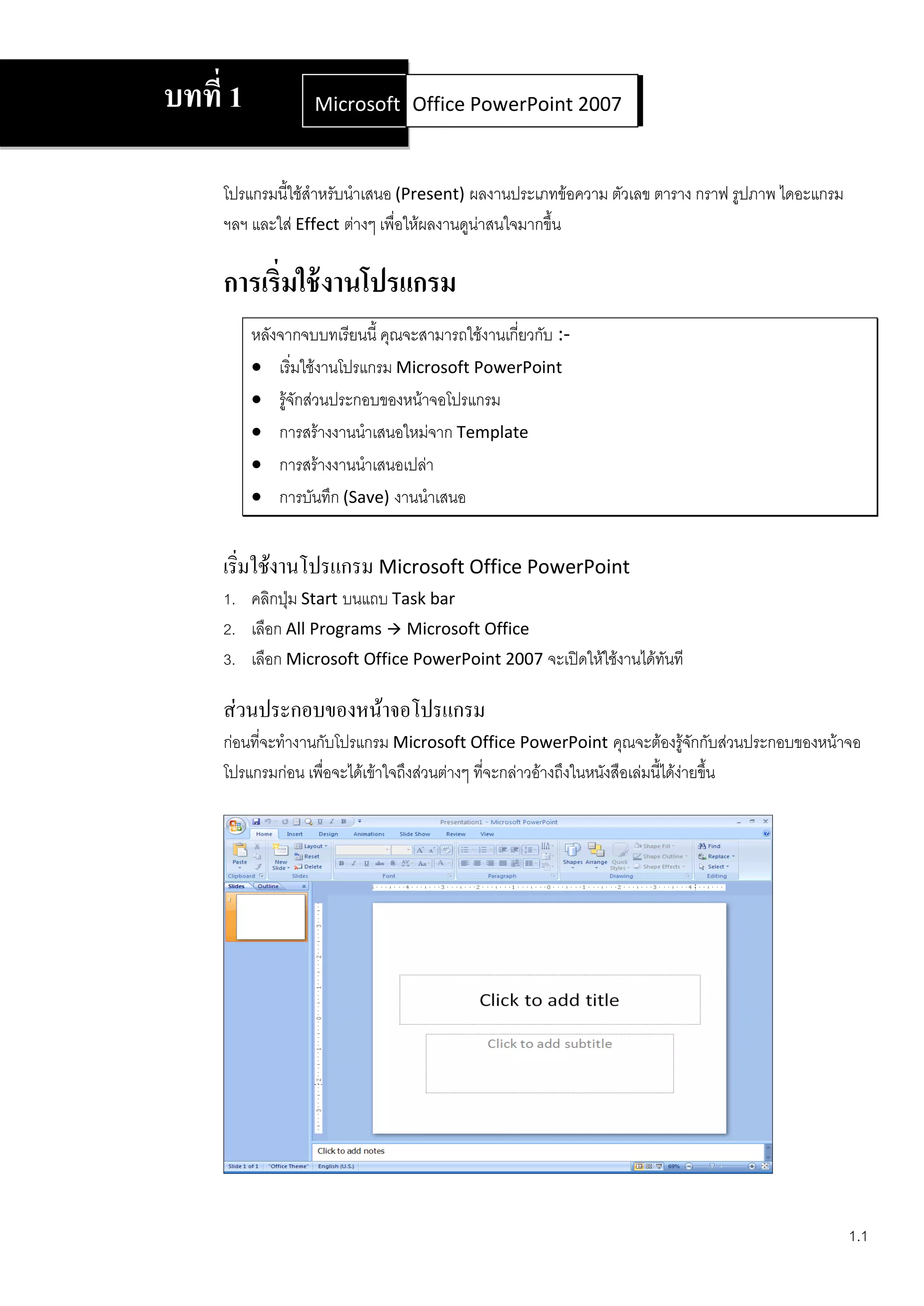 Microsoft Office Word 2007 2007 Office PowerPoint โปรแกรมนี้ใช้สาหรับนาเสนอ (Present) ผลงานประเภทข้อความ ตัวเลข ตาราง กราฟ รูปภาพ ไดอะแกรม ฯลฯ และใส่ Effect ต่างๆ เพื่อให้ผลงานดูน่าสนใจมากขึ้น การเริ่มใช้ งานโปรแกรม หลังจากจบบทเรียนนี้ คุณจะสามารถใช้งานเกี่ยวกับ :- เริ่มใช้งานโปรแกรม Microsoft PowerPoint รู้จักส่วนประกอบของหน้าจอโปรแกรม การสร้างงานนาเสนอใหม่จาก Template การสร้างงานนาเสนอเปล่า การบันทึก (Save) งานนาเสนอ เริ่มใช้งานโปรแกรม Microsoft Office PowerPoint 1. คลิกปุ่ม Start บนแถบ Task bar 2. เลือก All Programs Microsoft Office 3. เลือก Microsoft Office PowerPoint 2007 จะเปิดให้ใช้งานได้ทันที ส่วนประกอบของหน้าจอโปรแกรม ก่อนที่จะทางานกับโปรแกรม Microsoft Office PowerPoint คุณจะต้องรู้จกกับส่วนประกอบของหน้าจอ ั โปรแกรมก่อน เพื่อจะได้เข้าใจถึงส่วนต่างๆ ที่จะกล่าวอ้างถึงในหนังสือเล่มนี้ได้งายขึ้น ่ 1.1