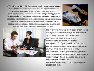 Доклад о проведении 'месячника налоговой помощи' в Новоульяновске описывает различные мероприятия, такие как консультационные линии и уроки по финансовой грамотности, прошедшие с 1 по 30 ноября 2014 года. В ходе мероприятия было проведено 6 обращений по налоговому и трудовому законодательству, а также рейды по выявлению незаконной деятельности в сфере такси. В мероприятиях приняло участие 149 человек.