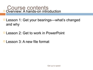The document outlines a training course for Microsoft Office PowerPoint 2007, focusing on its new user interface changes, particularly the introduction of the ribbon which consolidates commands for easier access. It includes lessons on getting accustomed to the new features, creating presentations, applying themes, and inserting content like pictures and charts. Additionally, it covers practical tips, keyboard shortcuts, and exercises to reinforce learning.