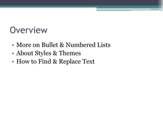 This document summarizes Microsoft Word 2007 Lesson 5 on using the Home tab. It includes exercises on opening recent documents, creating and formatting bullet and numbered lists, sorting lists, creating lists as you type, applying styles, and finding and replacing text. The lesson covers topics like bullets, numbering, styles, themes, and the find and replace tools in Word 2007. Exercises guide the user to practice these skills on sample documents.