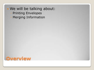 This document provides an overview of the Mailings tab in Microsoft Word 2007 and includes step-by-step exercises for printing envelopes and merging data into letters. The Mailings tab allows users to create labels, envelopes, and merge text from external sources into documents. The exercises demonstrate how to select an address to print on an envelope, create a list of recipient addresses, insert address blocks and merge fields into a form letter, and preview and edit individual merged documents. Completing the exercises provides experience with the key functions for mailings in Word 2007.