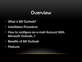 Microsoft Outlook is a powerful email, calendar, contacts, and task management program. The presentation discusses how to install Outlook, configure email accounts, organize emails using folders and rules, archive old emails to reduce inbox size, customize the navigation pane and other Outlook views, integrate with RSS feeds and MSN Messenger, and use Outlook's security features to block viruses. Key benefits of Outlook include managing all information and communications in one interface, instant searchability, and keeping users safe from junk email and malicious content.