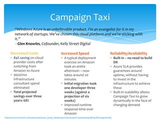 The document discusses cloud computing and the Windows Azure platform. It provides an overview of cloud models including infrastructure as a service (IaaS), platform as a service (PaaS) and software as a service (SaaS). It also describes key Windows Azure platform services such as compute, storage, SQL Azure database and content delivery network. Case studies are presented that demonstrate how companies have leveraged the Windows Azure platform to improve scalability, availability and reduce costs.