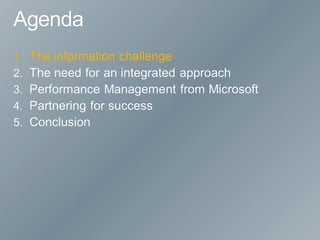 The document discusses the evolving role of finance organizations towards strategic management and decision-making, emphasizing the importance of integrated performance management systems that enhance visibility into business performance. It highlights the need for advanced capabilities, data integration, and actionable insights for various organizational levels to drive alignment and efficiency. Additionally, the document underscores the significance of continuous planning and the use of metrics to improve overall business performance.