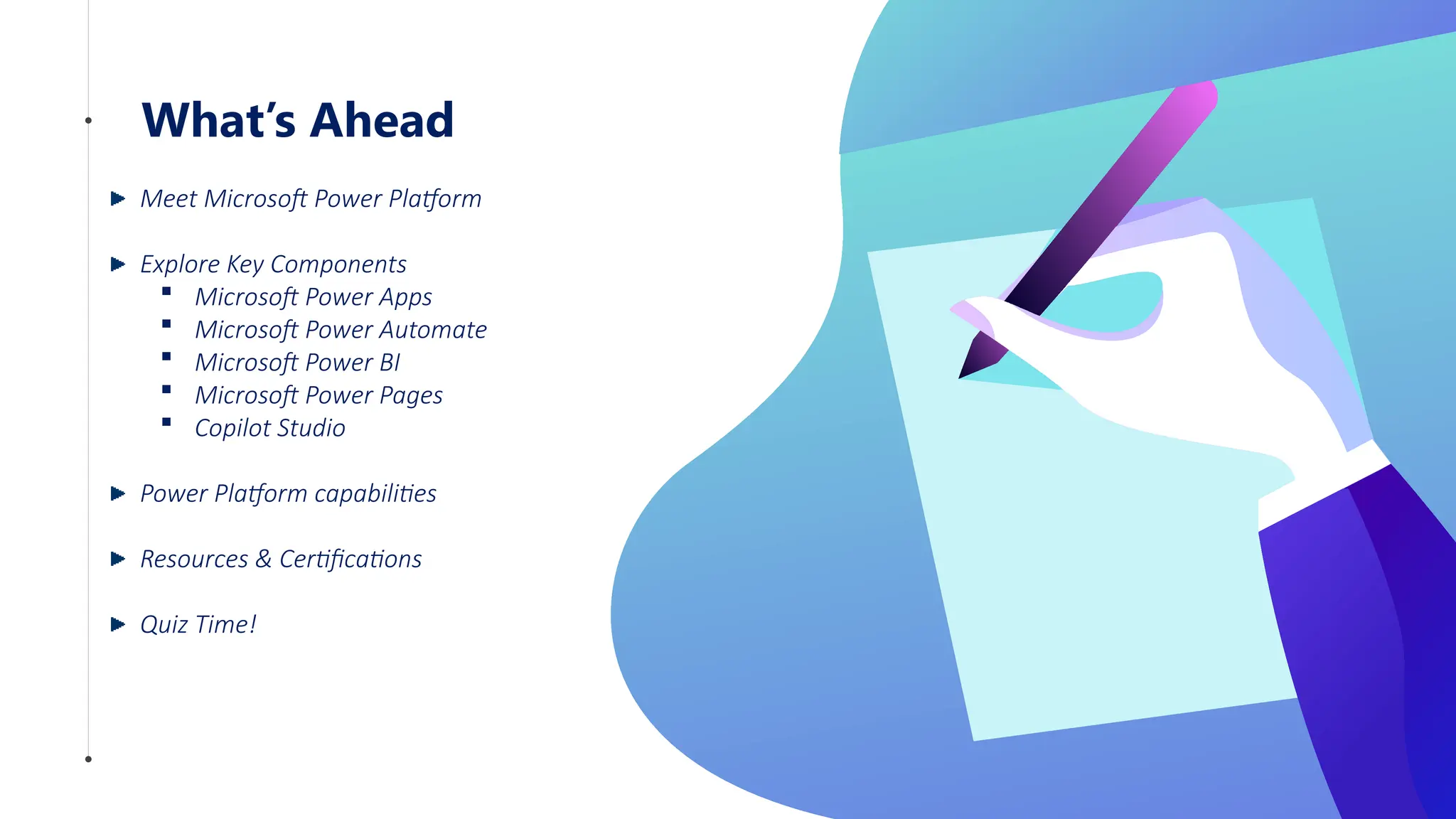 This deck is a quick tutorial to the Microsoft's Power Platform. It gives details about its key components - Power Automate, Power Apps, Power BI, Power Pages and Copilot Studio. It talks about its capabilities - Dataverse, Power FX, AI Builder, Connectors. It also provide further learning resources and certification information.