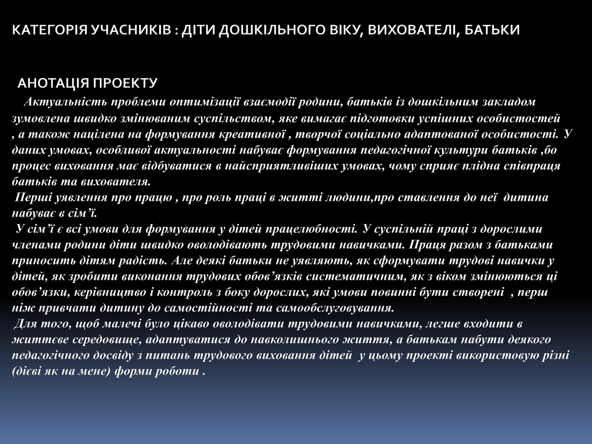 педагогічного досвіду з питань трудового виховання дітей у цьому проекті використовую різні